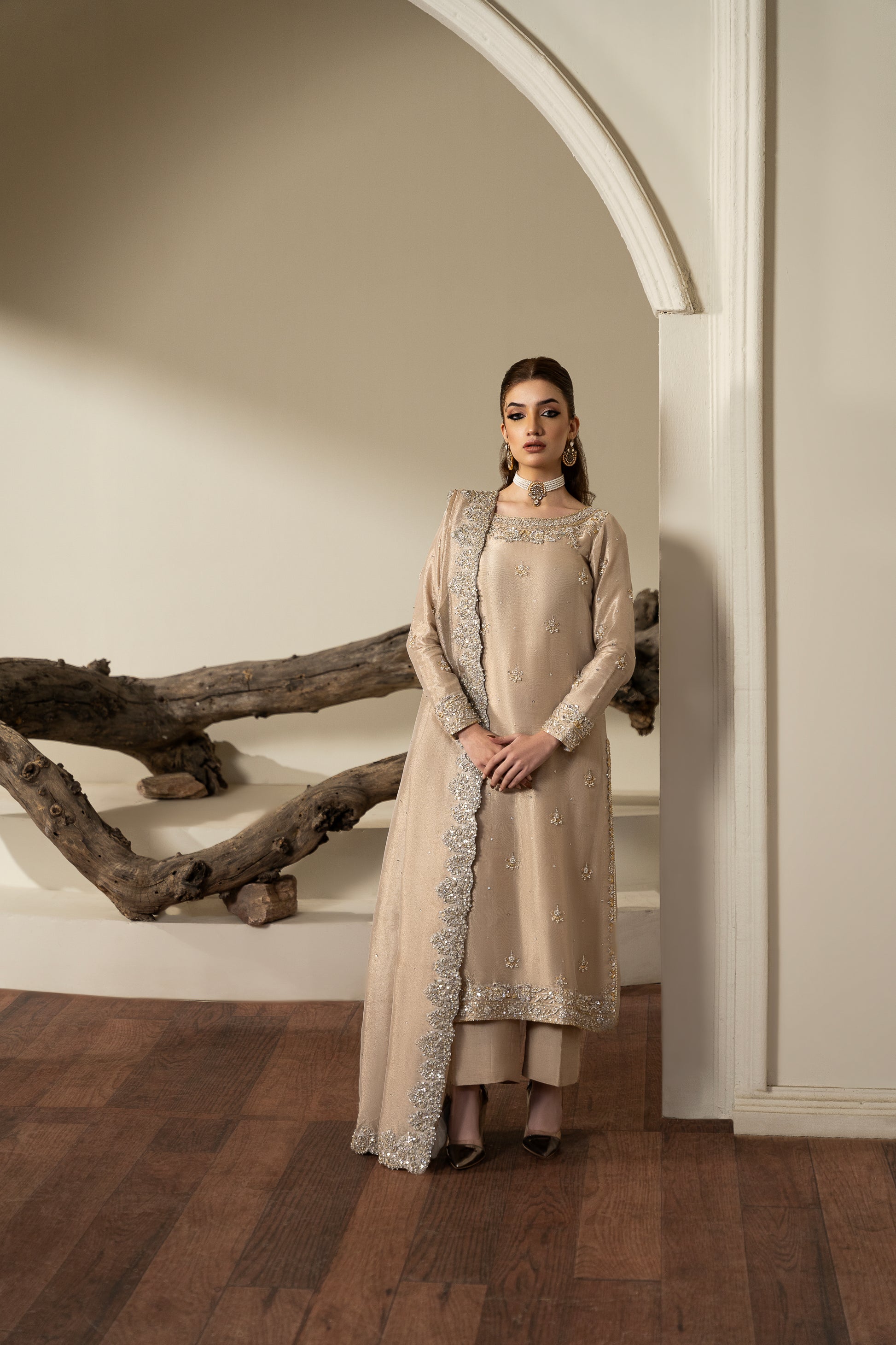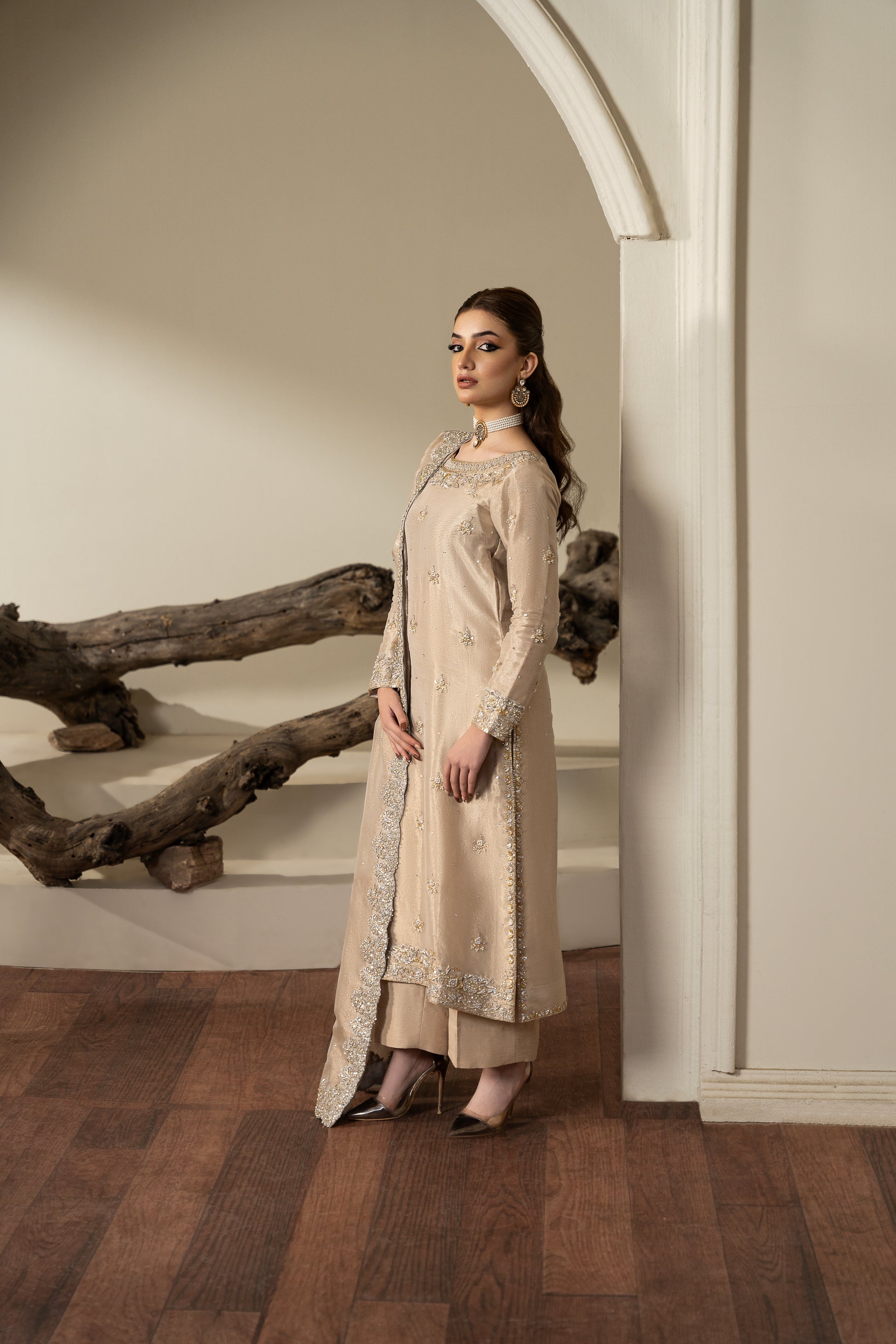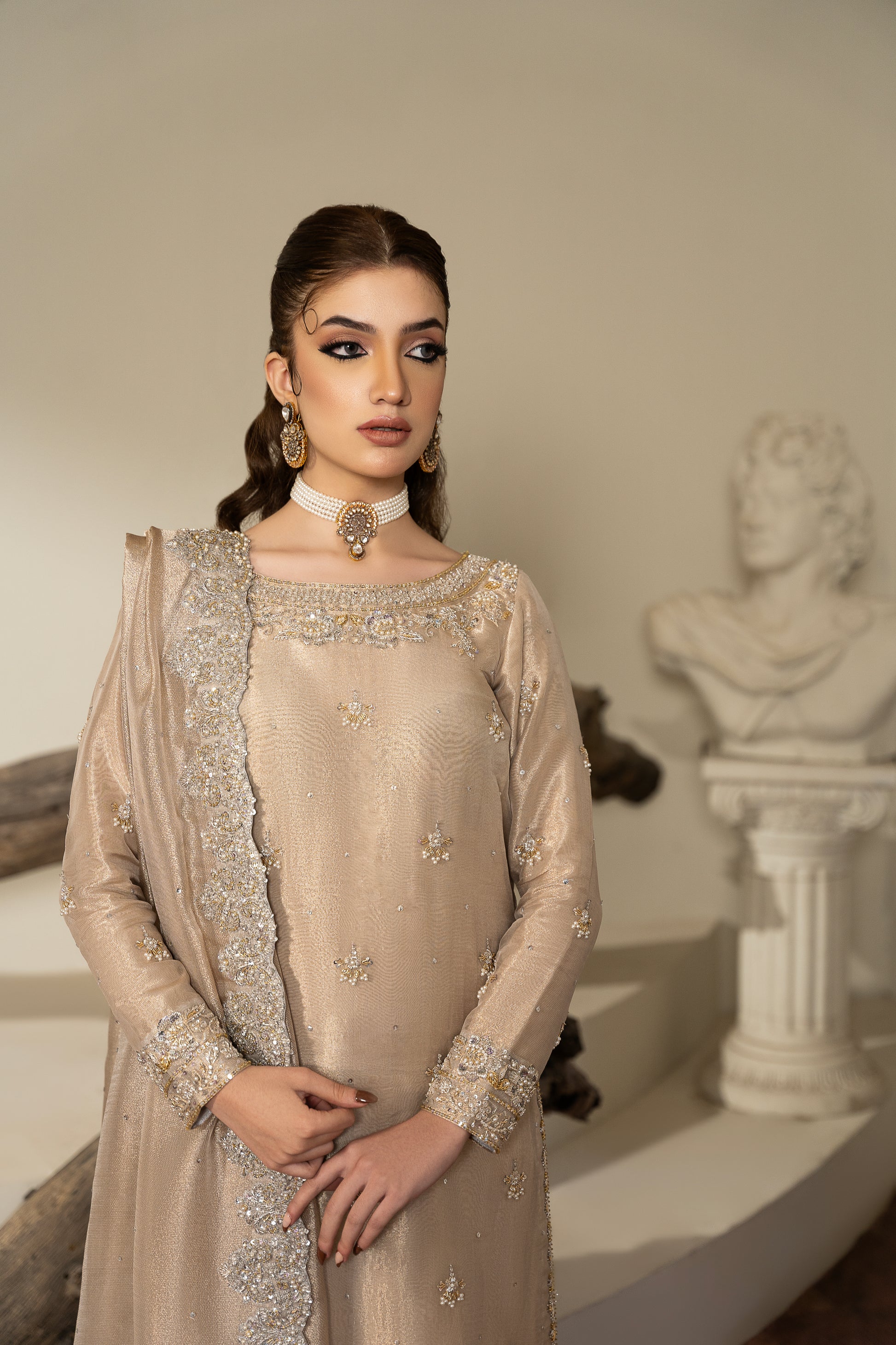 Introducing Amani! An outfit from our formal collection, a breathtaking chandi colored tissue outfit, adorn with intricate silver work including tilla, dabka, crystals and sequins. The perfect blend of traditional craftsmanship and modern sophistication.