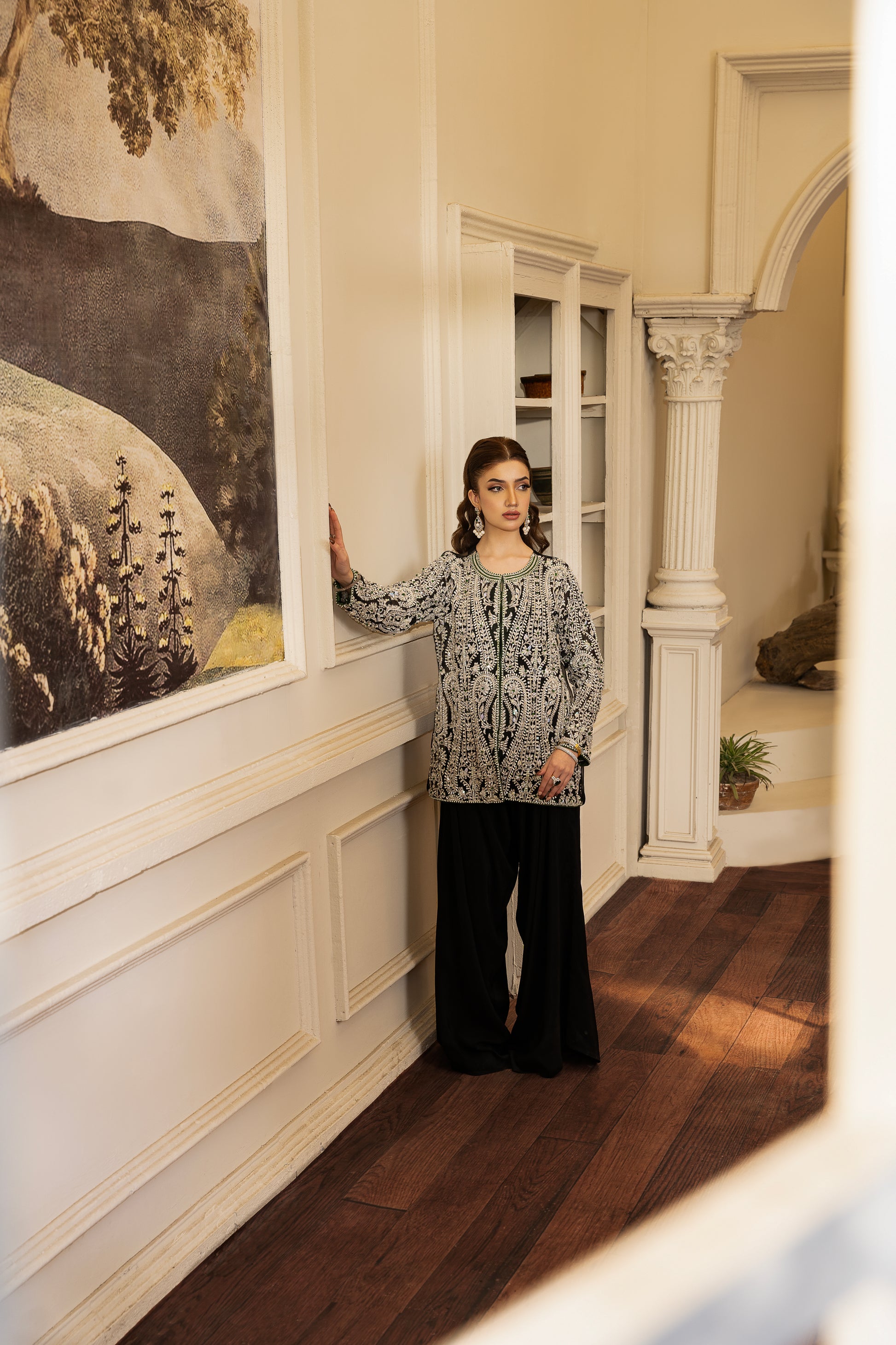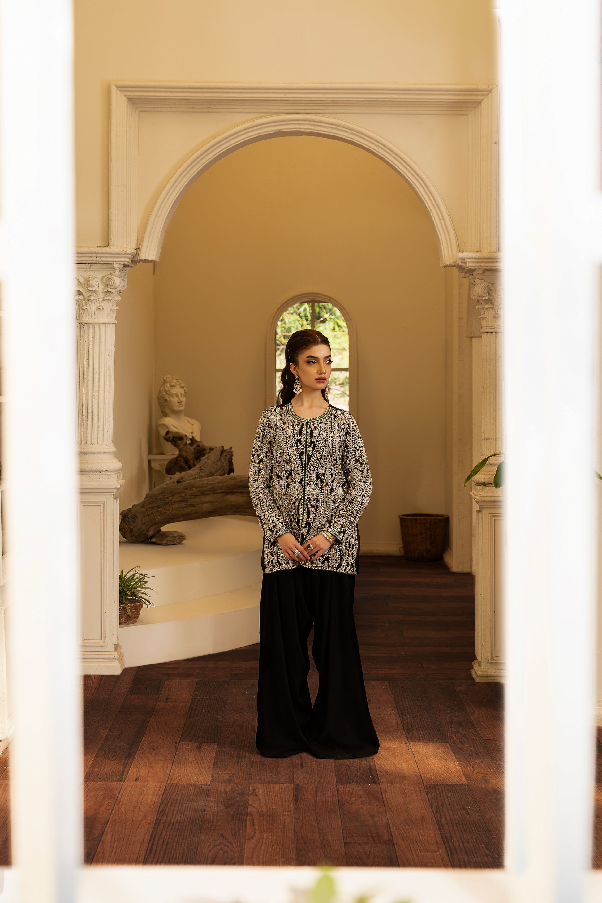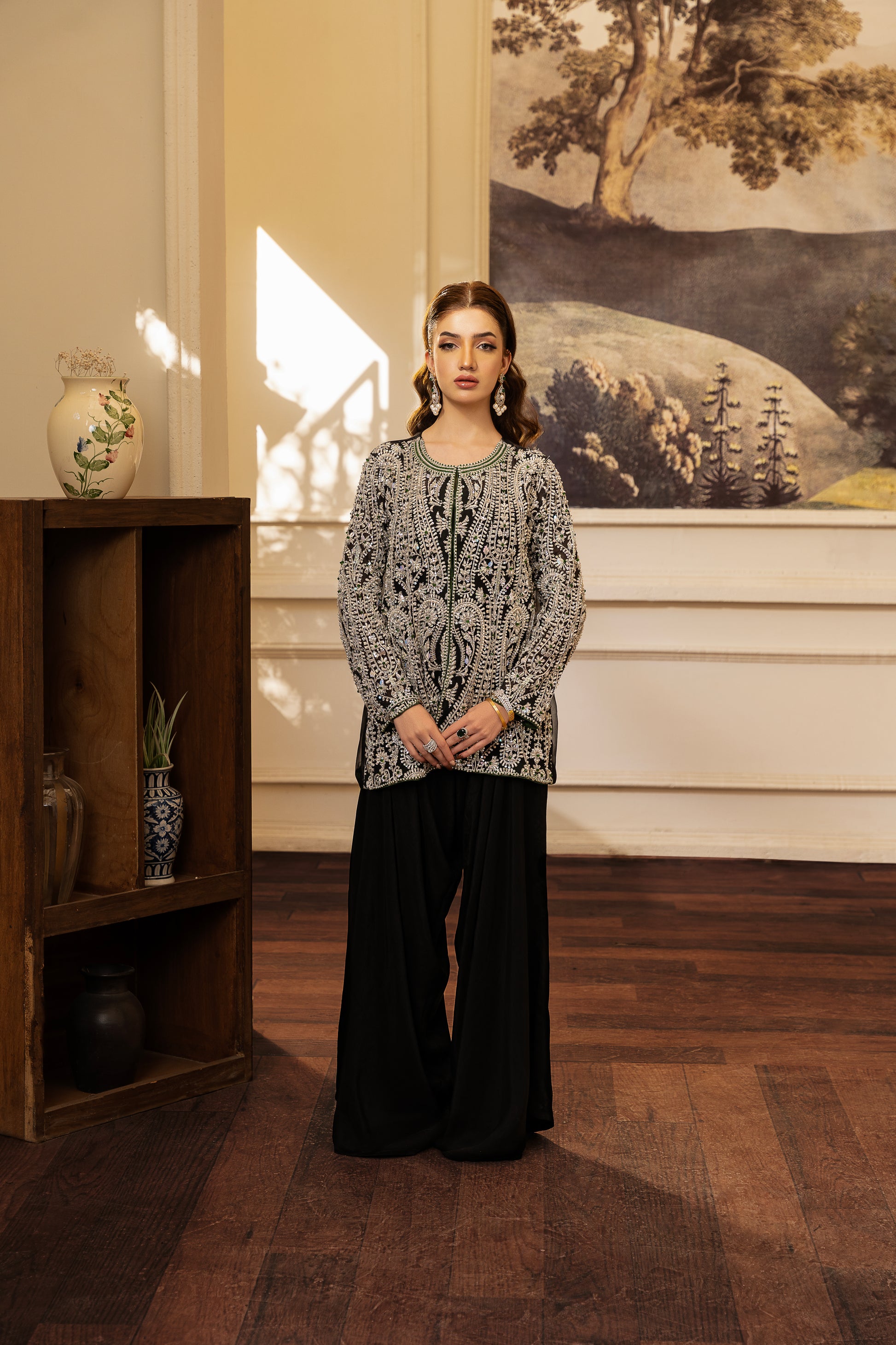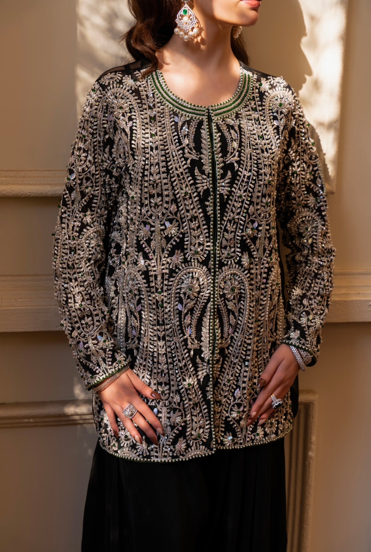 Presenting Aneeza! Black organza short jacket heavily worked with embroidery, beads sequins to add luxury to the outfit. Paired with parsi style sharara with wide leggedd cut and flare. Perfect for adding a stylish layer to your outfit.
