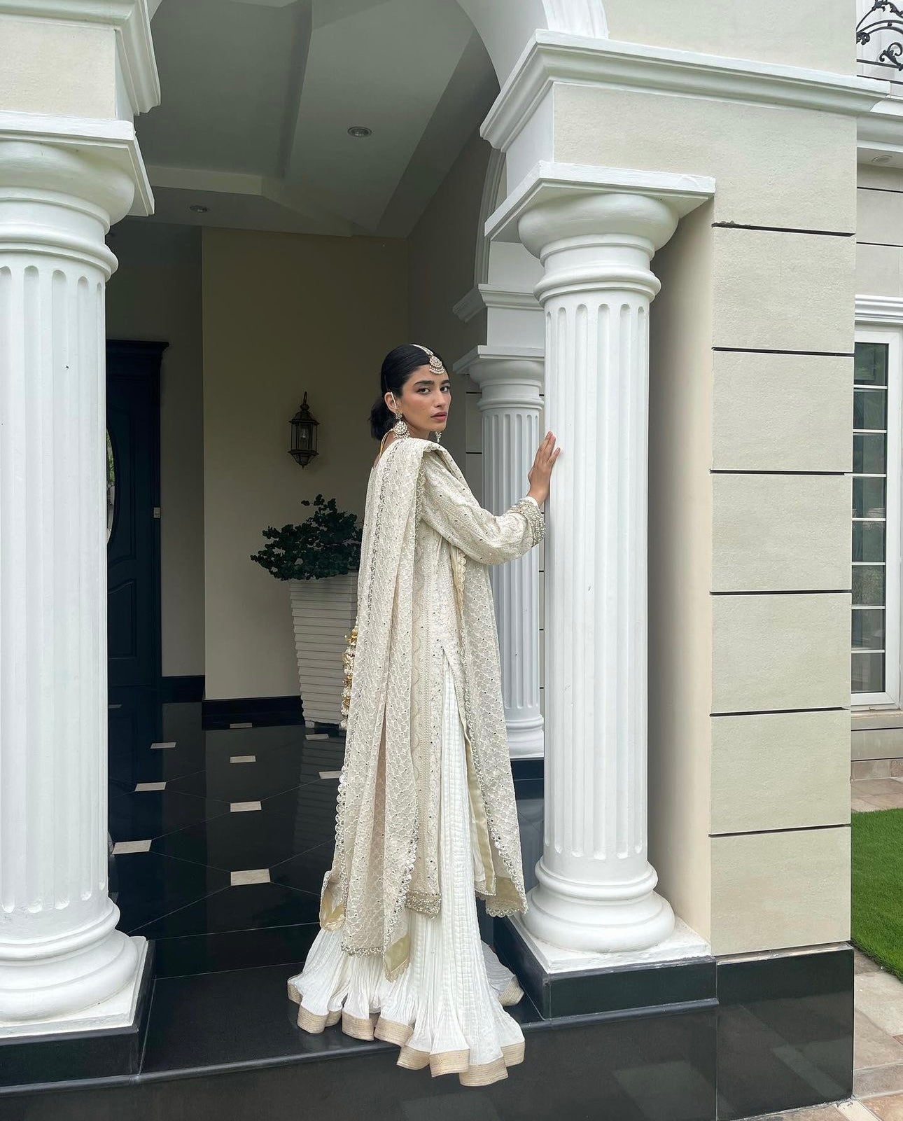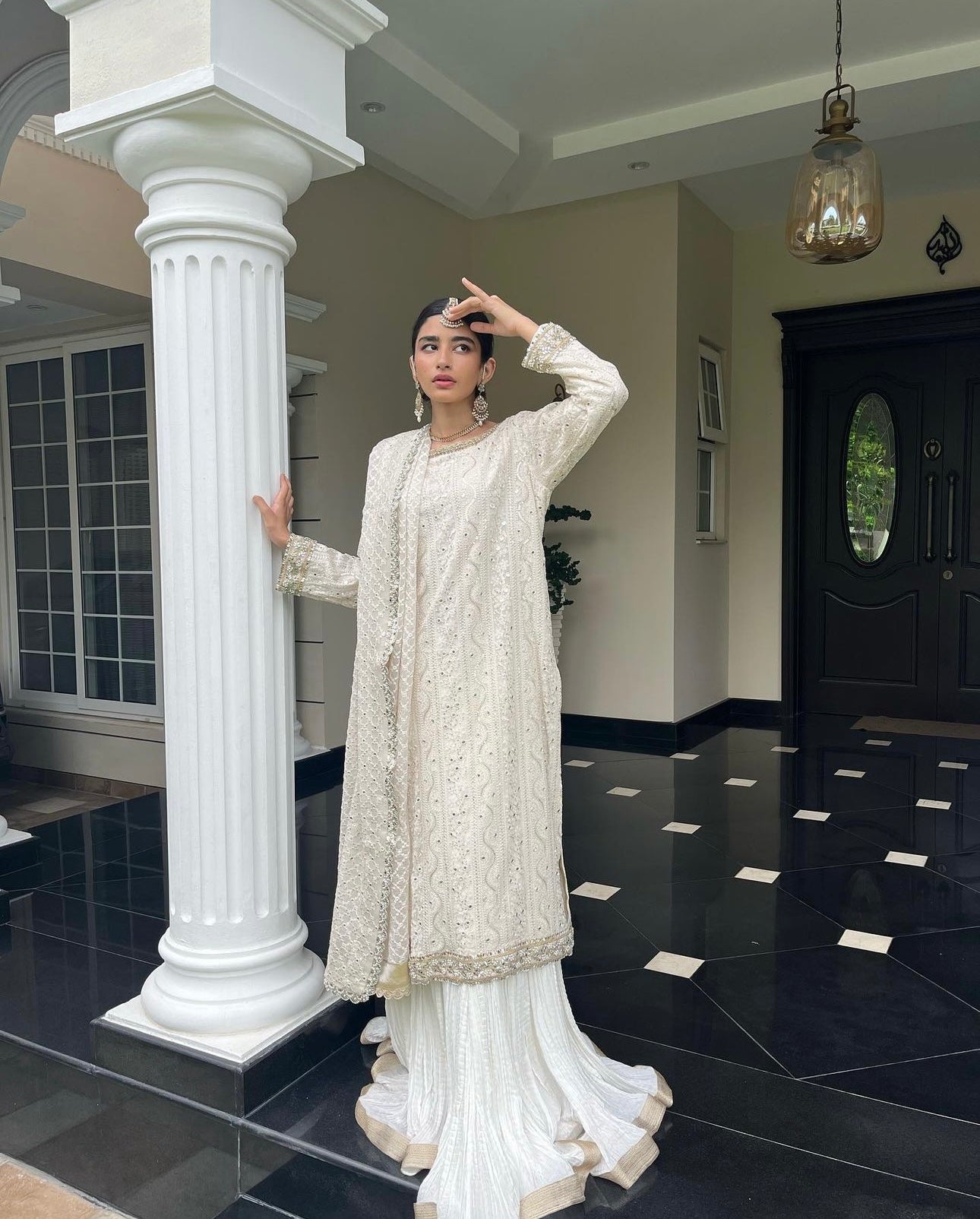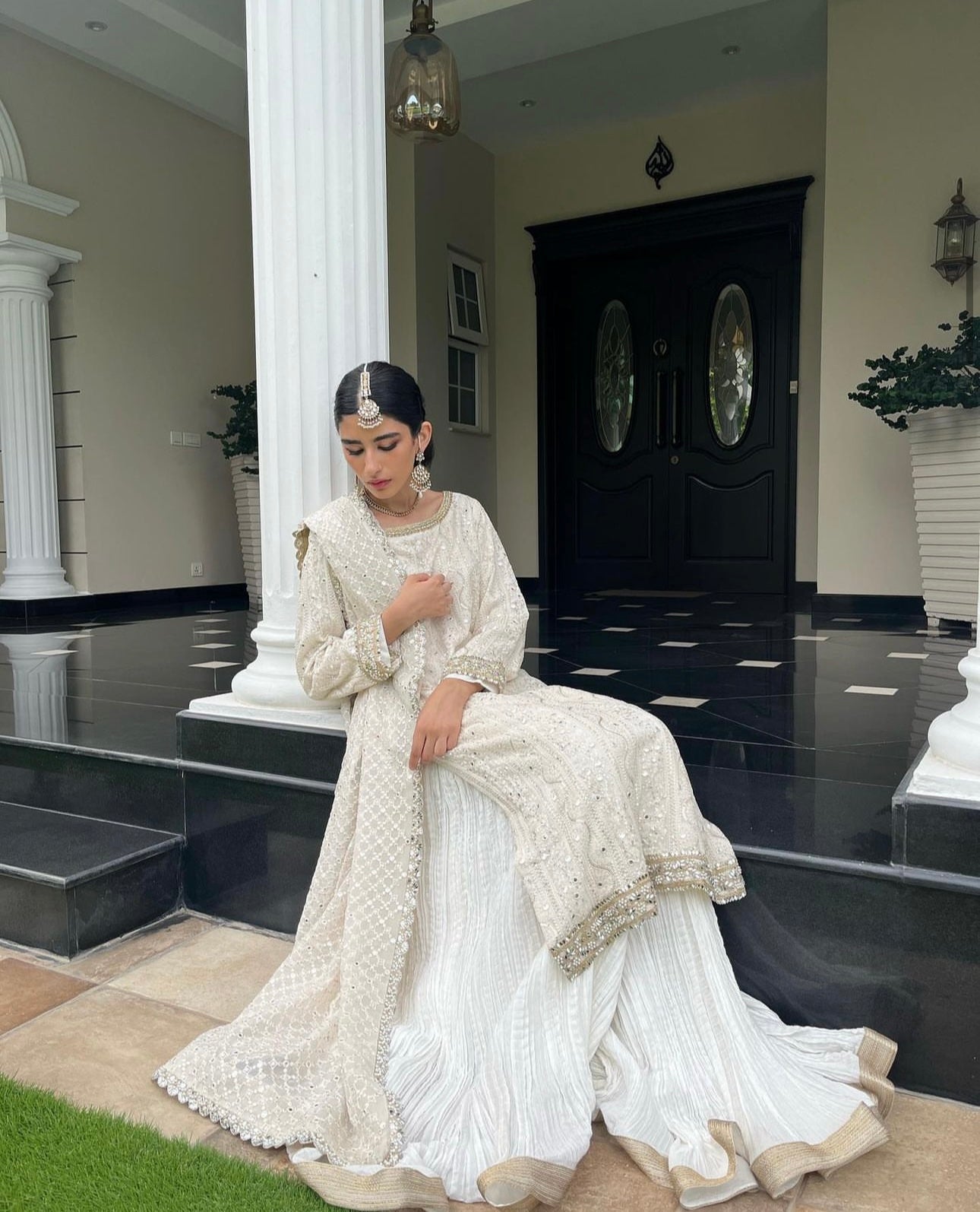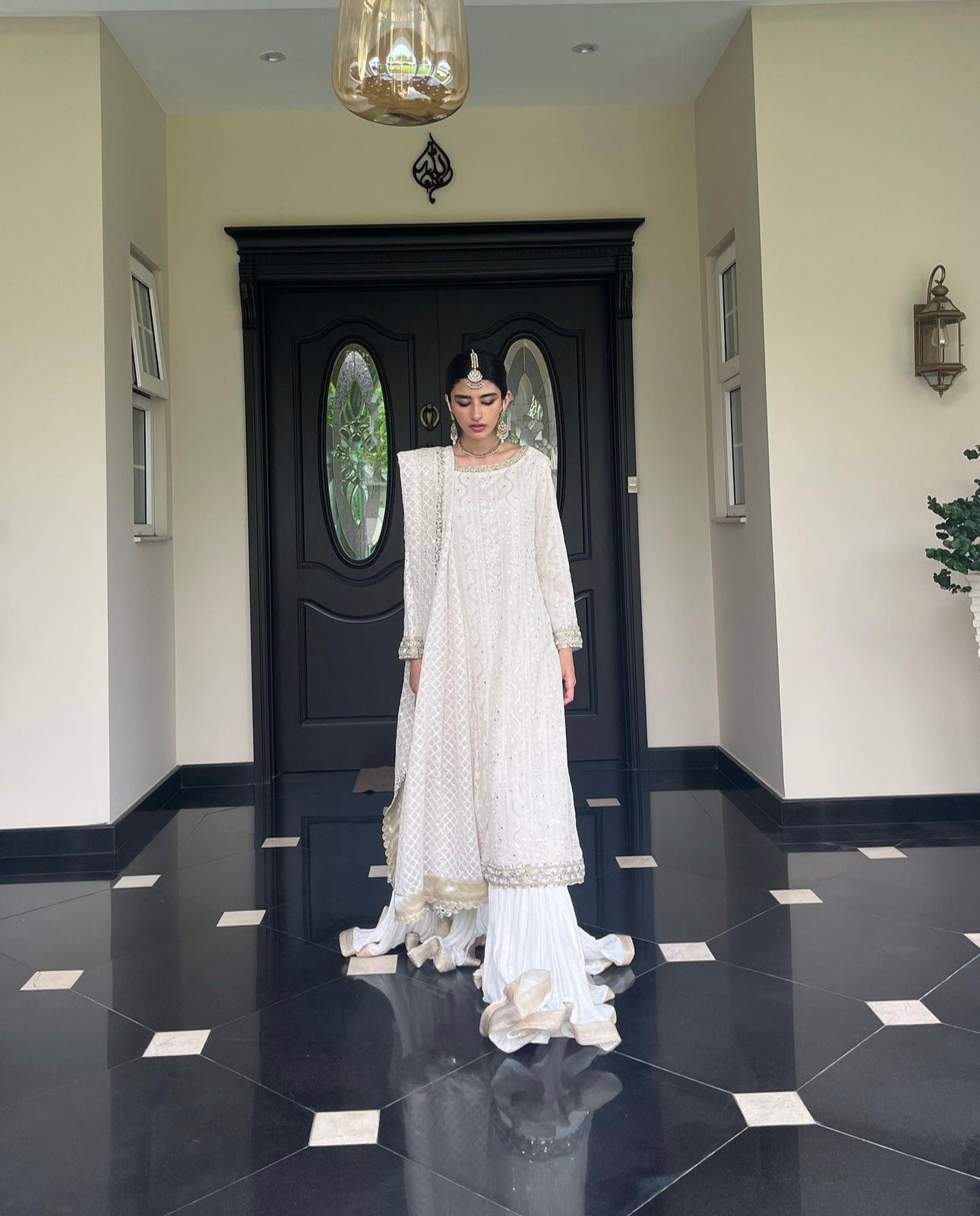 This white-themed, beautifully crisp white formal shirt is paired with intricate sheesha and panni work, along with delicate thread embroidery enhancing the shirt's intricate designs. It features a flowy sharara pant, perfectly draped to create a regal silhouette, and a magnificent heavy dupatta embellished with matching sheesha and panni work.