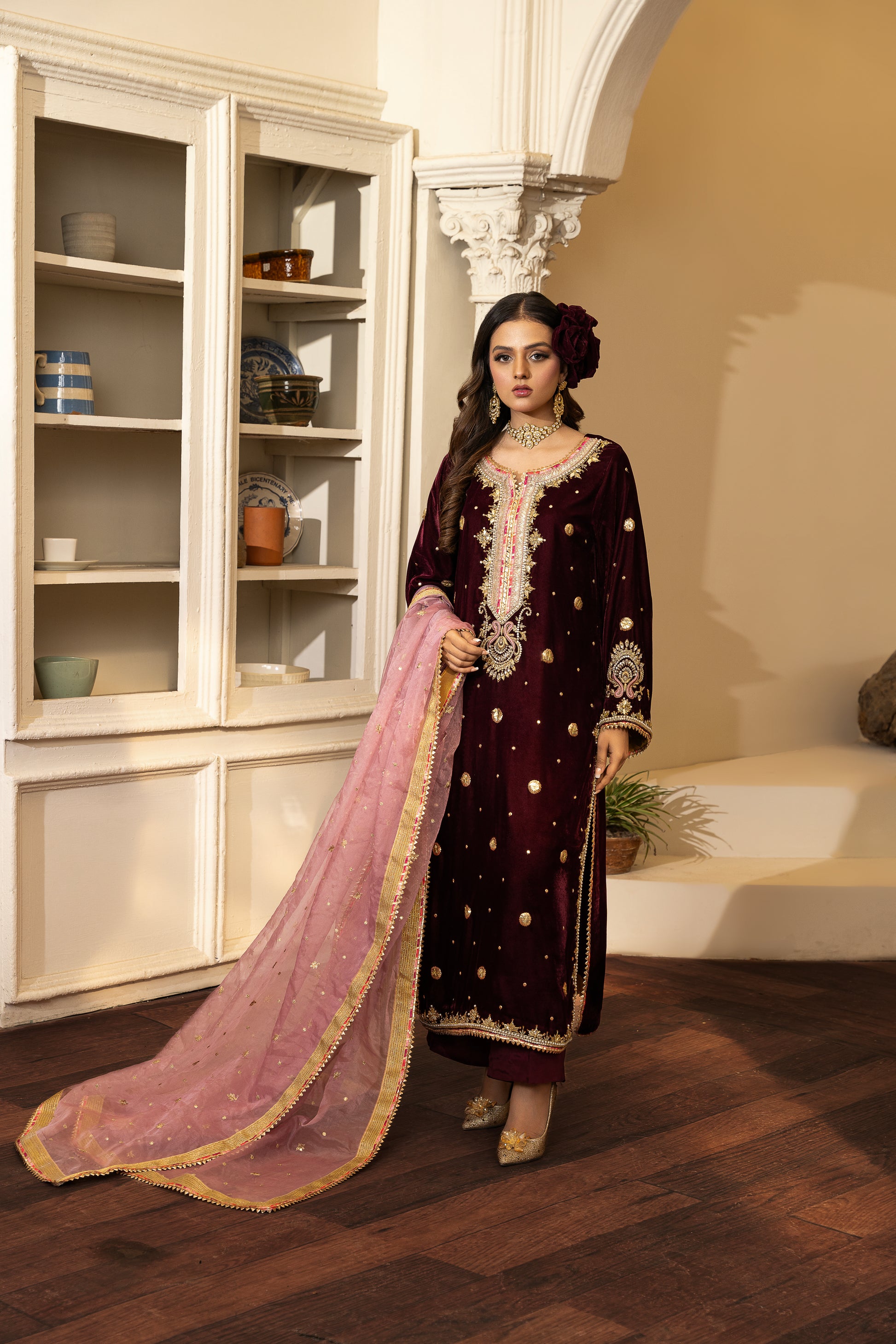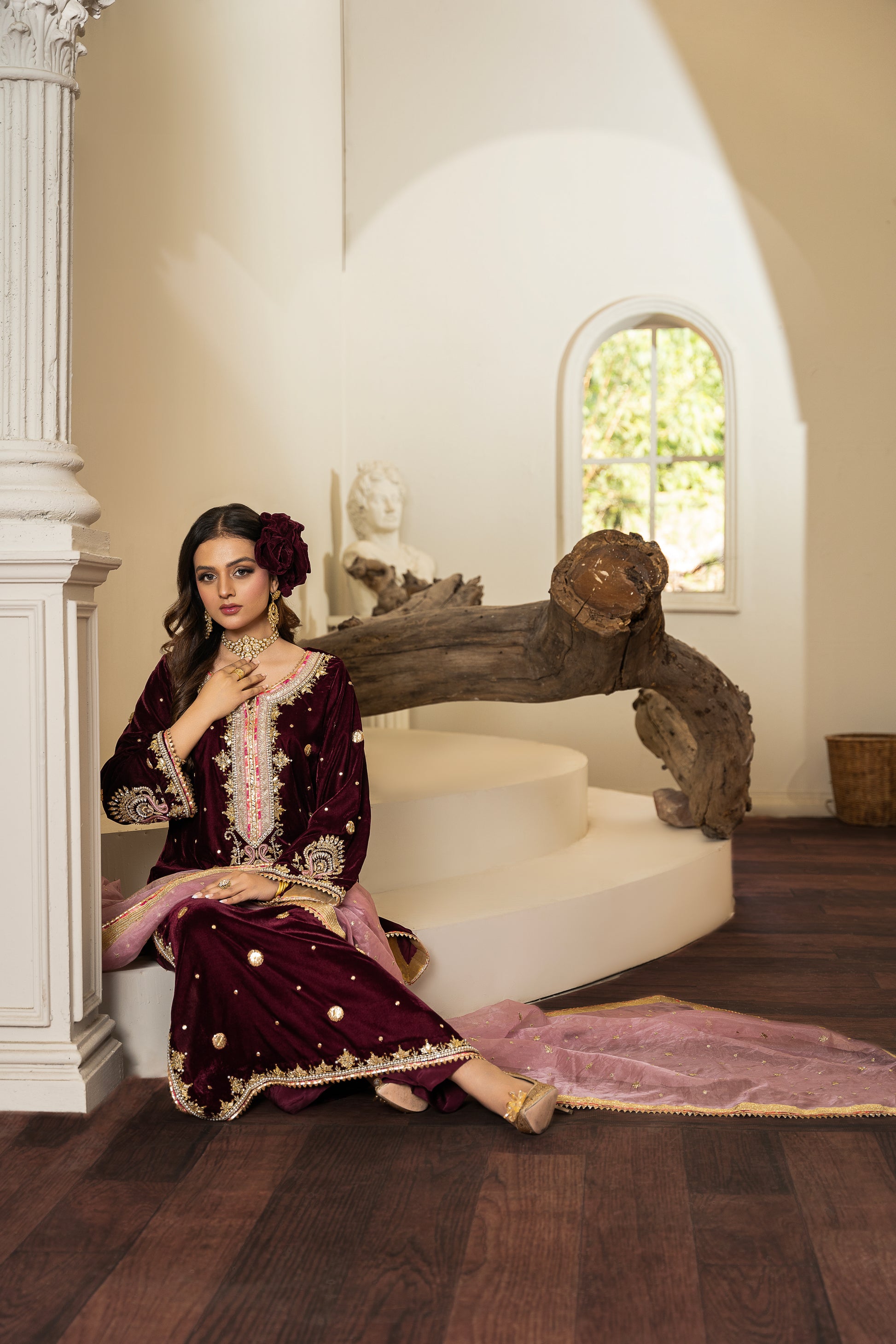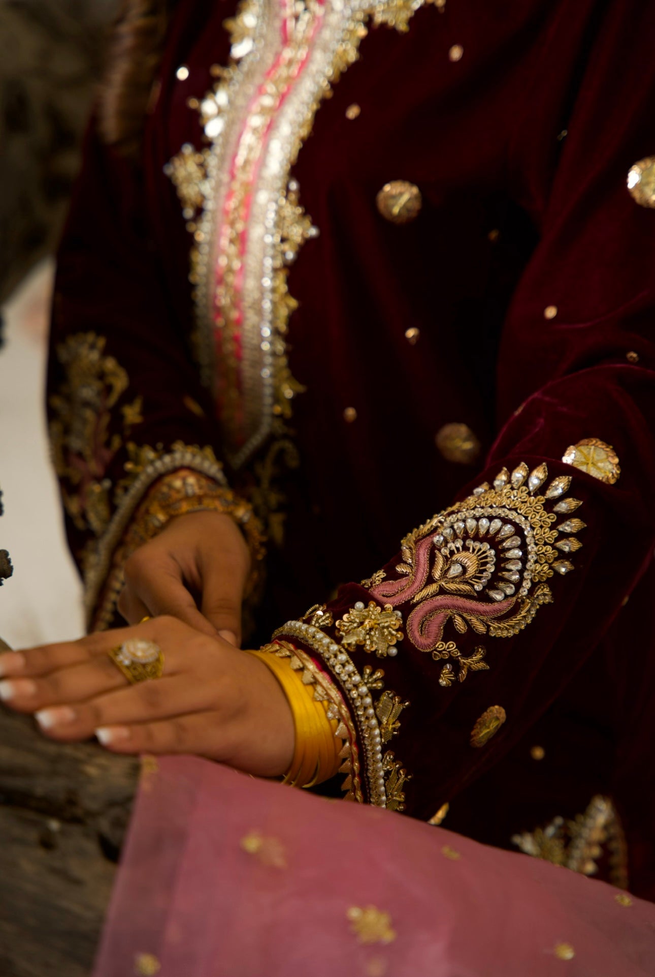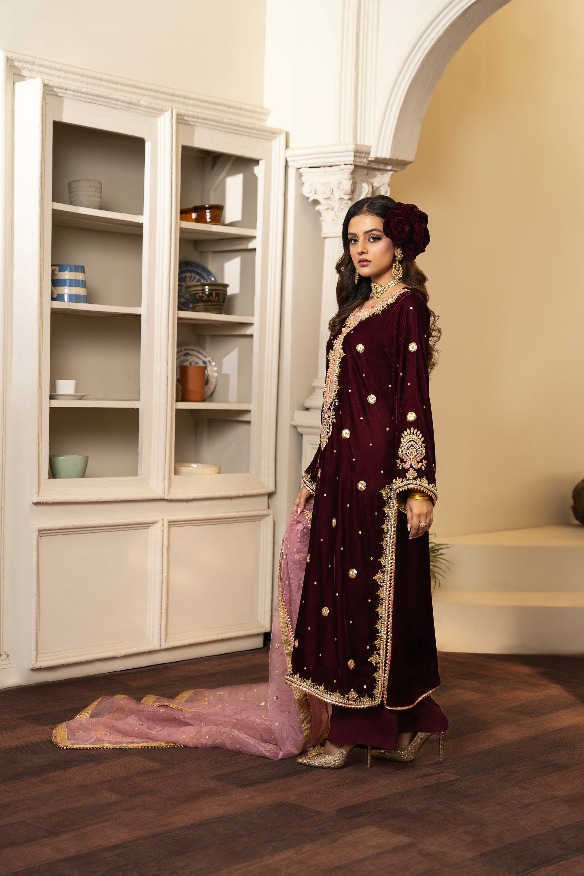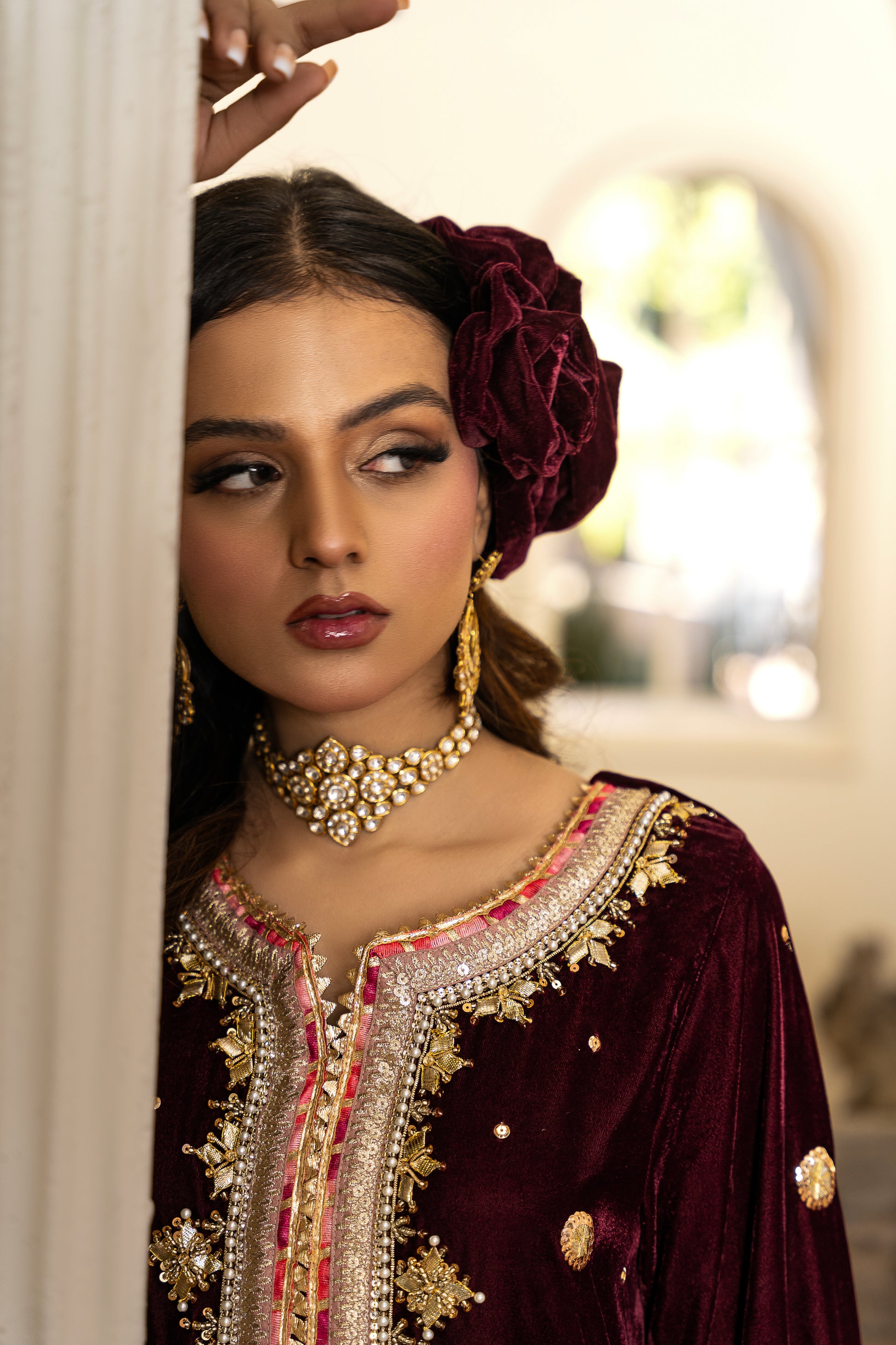 Introducing Rida! This stunning outfit made from luxurious velvet fabric that exudes opulene and sophistication. Sequins, French knots, and beautiful Gota work adds a touch of traditional craftmanship with beautiful resham and tilla motif that adds depth and visual interest. Paired with organza dupatta to complete the look.